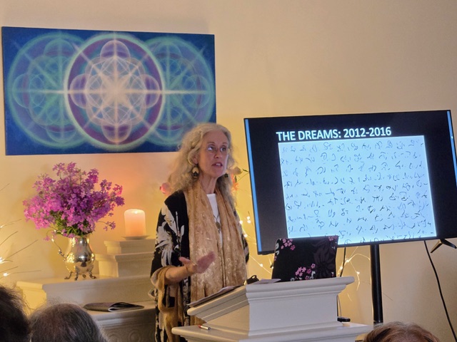 Thank you, Cynthia Marsh, our June/July featured artist in the Lotus Center for presenting an engaging talk last Saturday and generating lots of discussion about her first UFO sighting as a child, and the resulting intuitive connections that led to her artwork. Forty-two people attended and toured our new space at the Lotus Center. Karla Sikora provided an immersive sound bath experience with the crystal healing bowls before the talk, and John Houshmand treated us to beautiful guitar music during the wine and cheese reception.