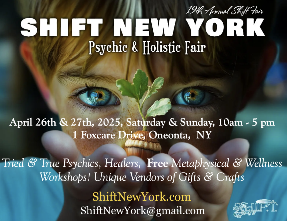 New Location! FoxCare Center (1 Foxcare Dr, Oneonta, NY 13820) The SHIFT NY Holistic & Psychic Fair introduces you to top Holistic Practitioners, Psychics, Vendors, and Spiritual Teachers from the Northeast who have tried and true answers to many of your questions. All healers and psychics are pre-screened for authenticity. Your $10/day or $15/2 days Advanced Price Admission Fee includes free admission to all 16 mystical workshops on subjects like meeting your guiding angel, past life regression, What's Your Spiritual IQ?, animal communication, connecting with loved ones in spirit, how to do your own 3 card Tarot reading, Interdimensional Channeling, an interactive dance presentation from the Happy Haggs, and so much more. We also offer some of the most interesting vendors of spiritual, holistic, & metaphysical items and crafts. Many are handmade items that make wonderful gift ideas. Pre-book at link below with your favorite reader or healer to save your private, confidential appointment!